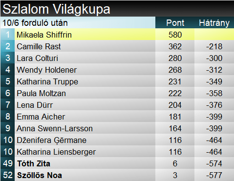 Mai veresége dacára természetesen simán vezeti a szakági tabellát Shiffrin, s adott esetben már a két hét múlva kedden Flachaun megrendezendő következő szlalomon bebiztosíthatja kilencedik kis kristálygömbjét. Ami az összetettet illeti, ambivalens a helyzet. Úgy fest, hogy az óriás-műlesiklásban kétszer nullázott Robinsont, a gyorsasági számokban nem eléggé domináns Goggia, valamint a mind ingatagabb Aicher nem fog Shiffrinre veszélyt jelenteni. Másrészt Rast – kétszámos sízőként is – tényezővé nőheti ki magát, amennyiben óriásban nagyobb pontkülönbséggel fogja verni az amerikait.