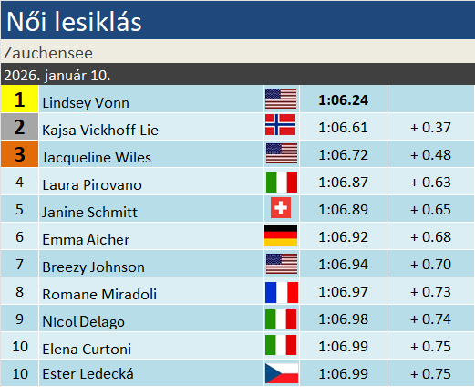 Lindsey Vonn 84. VK-sikerét aratta, így már csak kettő választja el korábbi kiemelt céljától, Ingemar Stenmark korábbi rekordjától. Ahogy egyik olvasónk felhívta a figyelmet, 10 éve Vonn ugyanitt nyert egy hasonlóan rövid lesiklást, de akkor tervezetten ilyen rövid, ráadásul kétfutamos lesiklást rendeztek.