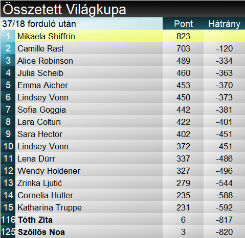 Kilencből négy lesiklás után az eddig minden versenyen dobogóra álló, és ebből kétszer győztes Vonn vezet a szakági tabellán. Előnye 100 pont fölé nőtt a ma a dobogóról leszoruló Aicherrel szemben. Pirovano, bár szintén nem állt dobogóra, a szakági tabellán leszorította a 3. helyről Hüttert. Az összetett legelején hétvégét kihagyó Shiffrin és Rast előnye egyarán volt akkora, hogy őket biztos volt már előzetesen is, senki nem fogja megelőzni. Ráadásul Robinson mindössze pár pontot gyűjtött ma. Aicher viszont jelentősen zárkózott az újzélandira a harmadik helyért folyó harcban.
