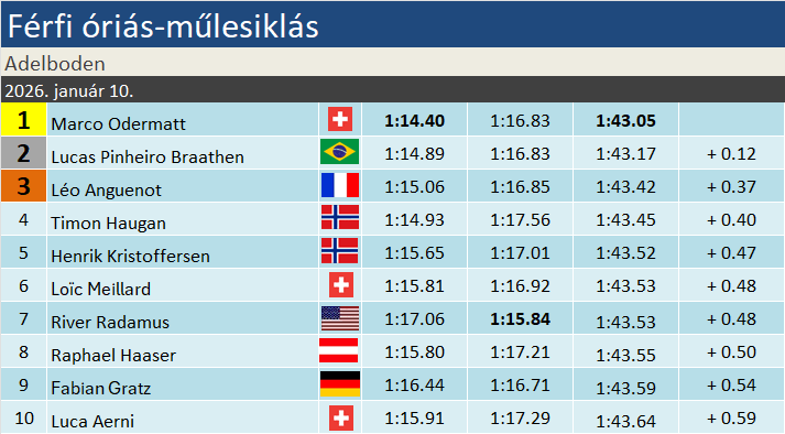Az időjárás hózápor formájában küzdelmessé tette az adelbodeni óriás-műlesiklás mindkét futamát, de a svájciak örömét azért nem tudta elrontani: Marco Odermatt fölényes teljesítménnyel megnyerte hazája egyik legjelentősebb versenyét – mégpedig zsinórban ötödszörre. A svájci mögött Lucas Pinheiro Braathen megőrizte második helyét, míg a dobogó alsó fokára Léo Anguenot állhat fel, megelőzve Haugant. Kristoffersen zárt az ötödik, Meillard a hatodik, míg Radamus a 30. helyről felegerészte magát a 7. helyre. Messze a legjobb futammal, de akkor még normálisak voltak a körülmények.