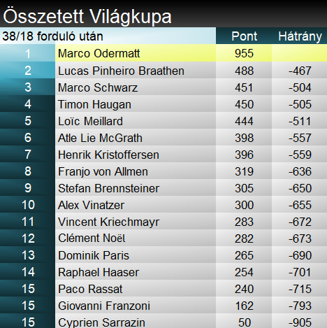 Marco Odermatt tehát a lehető legalkalmasabb helyszínen, az adelbodeni szentélyben aratta karrierje 51. Világkupa-elsőségét. Ezzel immáron egyedül, Tombán túllépve áll a férfi örökranglista 4. helyén. Még négy siker választja el a svájci etalontól, vagyis Vreni Schneidertől. Nem mellékesen még soha senkinek nem sikerült ötször egyhuzamban diadalmaskodni a Chuenisbärglin. Ettől függetlenül beérte Ingemar Stenmarkot, és minden valószínűség szerint hamarosan ő lesz Adelboden csúcstartója. Brennsteiner kiesésével nemcsak átvette a vezetést a szakági tabellán, hanem csaknem egy teljes futamgyőzelemnyi előnyt harcolt ki magának három versennyel a szezon vége előtt. Lucas Pinheiro Braathen huszadik alkalommal állt fel VK- dobogóra, nyolcadszor óriásban, és harmadszorra ezen a télen. Léo Anguenot másodjára mondhatta el ezt magáról. Kedveli a klasszikusokat a 27 esztendős savoyai, két éve Alta Badián ünnepelt a dobogón, akkor másodikként zárt.