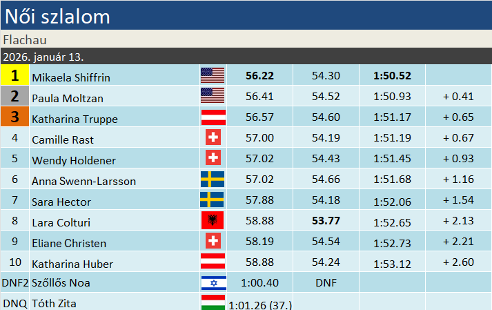 Mikaela Shiffrin nyerte meg a flachaui szlalomot, a női naptár legnagyobb pénzdíjú versenyét, miután a második futamban is jobb volt egy kevéssel honfitársánál, Paula Moltzannél. A hazaiak Katharina Truppe dobogójának örvendhettek, aki két századdal tartotta maga mögött Camille Rastot. Holdener, Swenn-Larsson, Hector, valamint a legjobb második futamot teljesítő Colturi zárt még a legjobb nyolc között. Szőllős Noa ígéretéhez híven ezúttal elment a végletekig, amit három TOP15-ös szektoridő fémjelzett. No, meg a látottak. Sajnos a vége előtt nem sokkal idejekorán fűzött be egy stanglit, így kiesett. Ezzel együtt ismételten megmutatta magát a nagyérdeműnek.