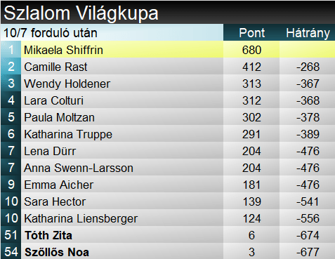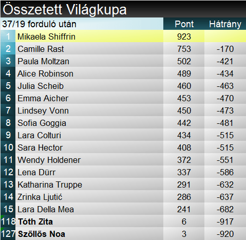 Egyelőre úgy fest, hogy Kranjska Gora csak a statisztikai hibahatár rovatba kerülhet bele. Mikaela Shiffrin ott folytatta, ahol Semmeringen abbahagyta. Visszatért a győzelem útjára. Szám szerint 107. győzelmét aratta a Világkupában, szlalomban pedig újabb kerek számhoz érkezett, a hetvenedikhez. Döbbenet… Az, hogy a 7/6-os mutató mellett még nem dőlt el a szakági pontverseny, köszönhető Rastnak, aki két 10. hely mellett nem tudott a negyedik helynél hátrébb végezni. Az már meglepetés lenne, amennyiben a januári végi Špindlerův Mlýn-i verseny után nem hirdetnének évadbajnokot szlalomban. Paula Moltzan nyolcadszor állt fel dobogóra, idén pedig harmadízben – két óriás-műlesikló pódium után. Említésre méltó még, hogy leszorította Robinsont az összetett TOP3-ából. Katharina Truppe nagyon konzisztens idén: a gyöngébb levi kezdés után mindig a legjobb hét között végzett. Ez az első idei dobogója, összességében pedig a hatodik.