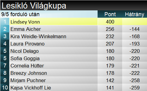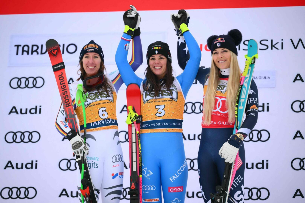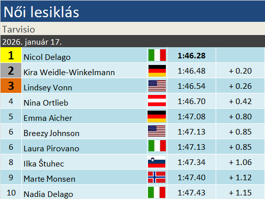 Nicol Delago múlt héten ünnepelte a 30. születésnapját, ezek után érzett rá nagyon a tarvisiói lejtőre. Ezt ma élete első Világkupa-elsőségére váltotta. Nem teljesen a semmiből jött ez a siker, hiszen a korábbi kétszeres junior-vb-érmesnek ez már a hatodik dobogója. A legutóbbit két éve, a saalbachi vb-főpróbán szerezte. Pályafutását egyebek mellett Achilles-ínszakadás és kulcscsonttörés szakította meg. Kira Weidle-Winkelmann nyolcadik alkalommal ünnepelhetett ma pódiumon, legutóbb Val d’Isére-be szintén másodikként zárt. Lindsey Vonnra pedig lassan elfogynak a szavak. Ha azt túlzás is lenne kijelenteni, hogy korábbi fényében csillog, és dominálja le a mezőnyt, per pillanat mégis az a helyzet, hogy az öt lesiklás mindegyikén dobogós helyen végzett. Ezzel együtt fölényesen vezeti a pontversenyt, és a milánói olimpia topfavoritjává lépett elő. Nem mellékesen immáron az összetett tabella TOP3-at erősíti. 144-szer állt dobogóra, 71. alkalommal lesiklásban.