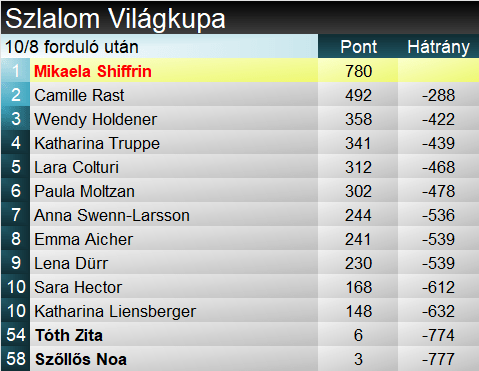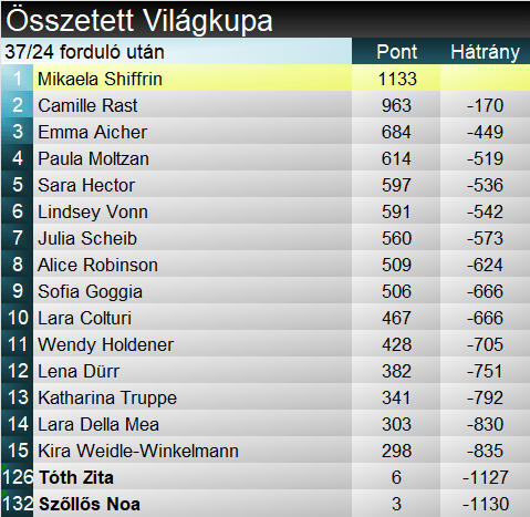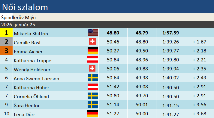 Camille Rast immáron tucatnyi dobogónál tart, ebből nyolcat ezen a télen gyűjtött. Emma Aicher pódiumainak száma nyolc, ami a szlalomot illeti, a harmadik a sorban. Összetettben ők ketten szorongathatják meg reálisan Shiffrint. Számszerűleg a svájci jár közelebb ehhez, ám ő szinte biztosan nem fog vállalni gyorsasági számot. Aicher már érdekesebb kérdés. A 450 pontos differencia soknak tűnik, ugyanakkor a hátralévő 12 versenyből 8 gyorsasági lesz. Crans-Montanán majd okosabbak leszünk. Pénteken és szombaton a lesiklóké lesz a főszerep, minden más pedig csak az olimpia után következik.
