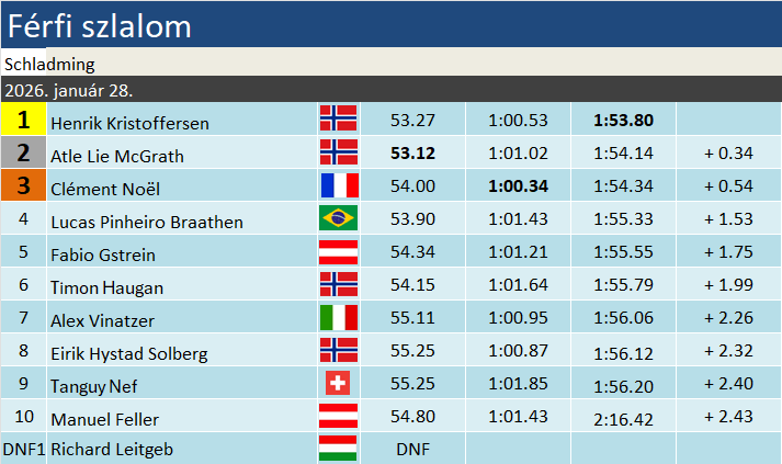 Parádés második futamot hozott az igen széttűzött vonalvezetés Schladmingban. Henrik Kristoffersen kiváló menettel helyet cserélt az első futamot megnyerő Atle Lie McGrath-tal . A harmadik helyre az este legjobbját síző Clement Noël jött fel, 8 helyet javítva. Braathen ugyan javított egy helyet saját edzője tűzésén, de ez inkább Rassat és Meillard kiesésének volt köszönhető. A legjobb osztrák Fabio Gstrein lett, 5 helyet javítva az 5. helyen. A szakági tabella élén újabb helycsere történt, ezúttal McGrath vezet, 1 ponttal Braathen előtt. Továbbra is hat síző van 100 ponton belül.