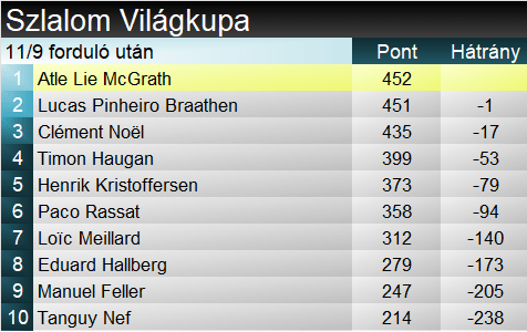 Ami a szakági világkupát illeti, 9 verseny és a teljes januári szlalomdöping végeztével továbbra is legalább hatesélyes a pontverseny, ráadásul eddig hét különböző győztest avattak. Az olimpiára legalább ennyi esélyessel vágunk neki, míg utána két verseny áll majd rendelkezésre, hogy a legjobbak eldöntsék a kristálygömb sorsát. McGrath a mai dobogóval ismét átvette a pontversenyben a vezetéstechnikai, előnye mindössze egy pont az eddigi éllovas Braathen előtt. Rajtuk kívül, Fellert leszámítva, az összes idei győztes, azaz Noël, Haugan, Krisotffersen és Rassat is 100 ponton belül várja az évvégi hajrát, azaz immár Kristoffersen is csatlakozott a közvetlen esélyesek táborához. Meillard viszont a mai nullázásával az esélyét ugyan nem vesztette el, de ennyi ellenfél mellett 150 pontos lemaradása már jelentős. Az összetett ennél jóval egyértelműbb, Odermatt 500 ponton túli előnnyel vezet. A svájci mögé most felsorakoztak a kétszámos technikai specialisták.