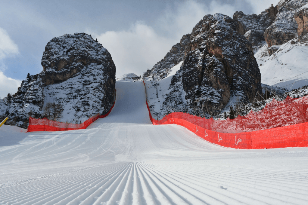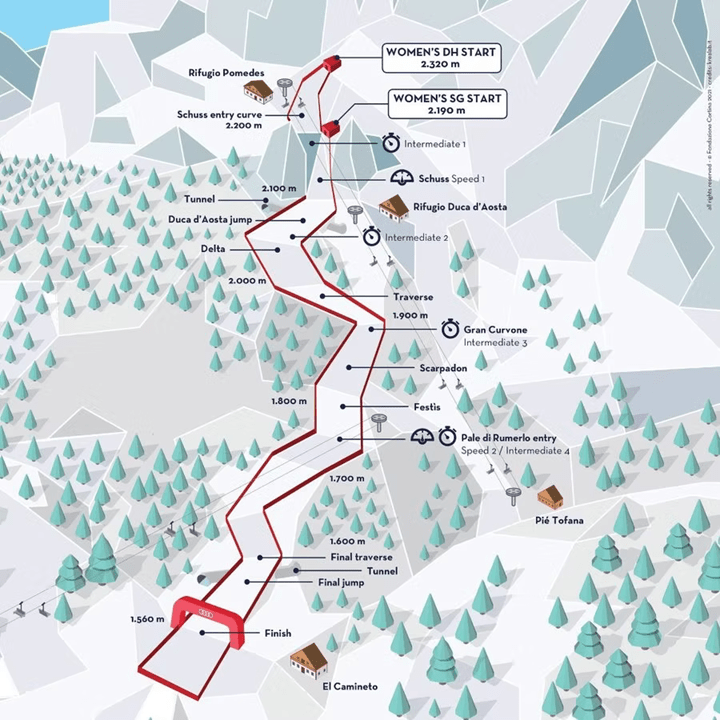 A lesiklás a Tofana-hegy oldalán, 2 320 méteres magasságban kezdődik, a híres Schuss-szakasszal, amely a pálya legmeredekebb része. Itt a lejtés eléri a 63–65%-ot, ami a női világkupa-lesiklók között is extrém meredeknek számít. A versenyzők már az első pillanatban magas sebességgel indulnak, és azonnal komoly testhelyzet-stabilitást és élszög precizitást igényel a gyors jobbos és balos ívek kombinációja. A balos ív fokozatosan átvezet a Duca d’Aosta-ugratóhoz, ahol a repülés hossza eléri a 35–40 métert, és a pontos érkezés kritikus a sebesség megtartásához.
