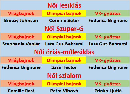 A hölgyeknél szintén nem találunk kétszeres olimpiai bajnokot, az ellenben többször igazolódott, hogy az erős, adott esetben lehengerlő Világkupa-évad sem garantálja a sikeres olimpiai szereplést. Merthogy hiába nevezték egykoron szlalomkirálynőnek, Marlies Schildnek például soha nem adatott meg, hogy a dobogó tetejéről énekelhesse az osztrák himnuszt. Pedig háromszor is zárt pódiumon. A 21-szeres VK- győztes Erika Hesstől egy harmadik helyre futotta, Perrine Pelen és Pernilla Wiberg számára ennyi sem adatott meg. A lányoknál gyakrabban remegnek meg a lábak, főként délután, többek közt emiatt történhetett meg 4 éve, hogy a nyolcadik helyről nyert olimpiai bajnokságot Vlhová.