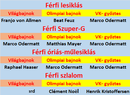 Talán az 1988-as Calgary-i olimpiáig kellene visszanyúlnunk az időben, ha egy topfavorit álmának beteljesülését szeretnénk felidézni, akkor és ott Pirmin Zurbriggen győzedelmesedett lesiklásban. Azóta olyan Világkupában nyeretlen outsiderek aratták le a babért, mint az osztrák Patrick Ortlieb, az amerikai Tommy Moe, a francia Jean-Luc Crétier, vagy a honfitárs, Antoine Dénériaz. Didier Défago és Matthias Mayer győzelme sem volt az a kiköpött papírforma, előbbi egy régi motorosnak számított a szakmában, aki nem volt a századok kegyeltje, az osztrák csak egy reményteljes tehetségként érkezett Szocsiba. Svindal pjongcsangi, majd Feuz pekingi sikerét pedig egy életmű megkoronázásaként is felfoghattuk.