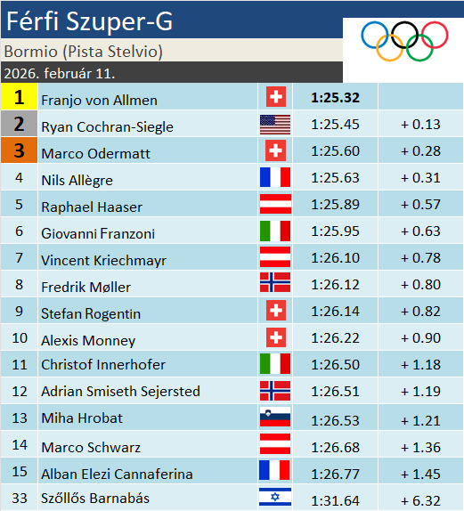 Franjo von Allmen egyszerűen felülmúlhatatlan az olimpián! A lesiklás és a csapatkombináció aranya után szuper-G-ben sem talált legyőzőre! A svájci, immár háromszoros olimpiai bajnok 15 századdal előzte meg Ryan Cochran-Siegle-t, aki Peking után szerzett ismét ezüstérmet a számban. Marco Odermattnak egy kisebb hiba után be kellett érnie a bronzéremmel, nem sokon múlt, hogy Nils Allègre mögé kerüljön. A francia mögött következett a legjobb osztrák és olasz, Haaser és Franzoni személyében.