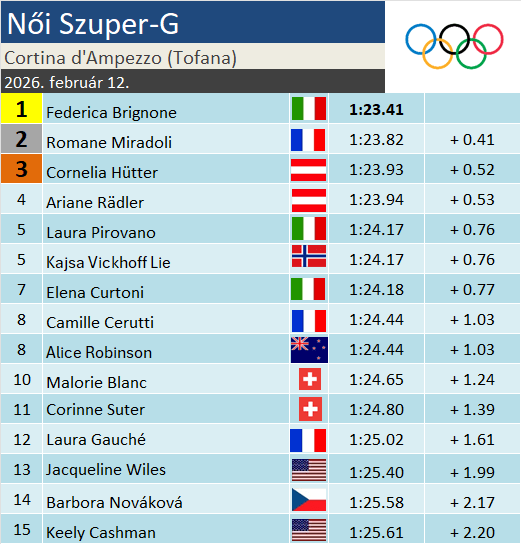 Hatalmas csillaghullást és talán az olimpia egyik legnagyobb sztoriját hozta a nők cortinai szuperóriás-műlesiklása. Federica Brignone a visszatérését követő 4. versenyen, 10 hónappal a karrierjét kis híján derékba törő sérülést követően olimpiai bajnok! Az igen trükkösre tűzött szuper-G-n a látási viszonyok sem voltak a legkedvezőbbek, így különösen nagy kihívást jelentett ma délelőtt a lejtőn síelni. Fede a legjobbak blokkjának elején indult, és az egész verseny legtaktikusabb, pontosabb síelését láthattuk tőle. Romane Miradoli megszerezte a franciák első alpesi érmét, hátránya azonban már közel fél másodperc volt Brignonéhoz képest. Az osztrák hölgyek újabb medáliával gazdagodtak, immár Cornelia Hütter is olimpiai érmes! Az esélyesek legnagyobb része mind elvérzett a nehéz tűzésen, kaput tévesztett nagy előnyből Goggia ahogy többek közt Aicher és Ledecká is. A dobogóról mindössze 1 századdal maradt le a bombaformában síző Ariane Rädler akit Lie és Pirovano követett holtversenyben.