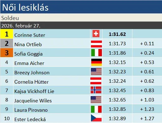 2020 szakági világkupagyőztese, Cortina világ- és Peking olimpiai bajnoka, Corinne Suter mindössze 6. VK-futamgyőzelmét aratta ma. Legutóbb 2022 decemberében nyert a világkupában, de legutóbbi dobogóját is tavaly kell keresni. Az idei szezonja eddig messze elmaradt a várakozásoktól, mivel a december eleji lábsérülése miatt csak januárban kezdte meg a szezont. Nina Ortlieb karrierje 5. dobogóját szerezte ma, a harmadikat lesiklásban. Eddig a sorminta alapján minden harmadik szezonban előbb dobogóra állt lesiklásban, majd ezt követte egy szuper-G győzelem. 2020 és 2023 után ehhez 2026-ban is megvan az első lépés. Sofia Goggia karrierje 67., idei 5. dobogóját ünnepelhette. A leggyorsabb szakágban mindössze 1 dobogó választja el a 40-től.