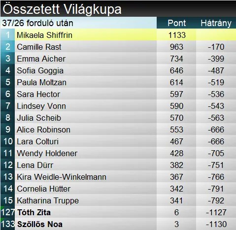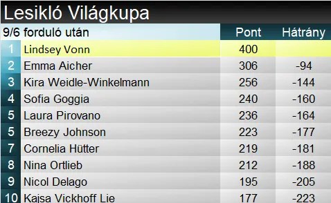A szakági világkupa élén egyelőre még Vonn áll, de az amerikai mögött egyre inkább zárkózik a két német, Aicher és Weidle. Előbbi 100 ponton belülre csökkentette lemaradását, 3 versennyel a szezon vége előtt. A kis kristálygömbért folyó versenyfutás azonban rendkívül szoros: Goggia, Pirovano, Johnson, Hütter és Ortlieb is esélyes még a német mellett. Az összetett ennél talán valamivel egyértelműbb: Shiffrin előnye ugyan nem tetemes Rasttal szemben, de 170 pont 4 technikai számmal a szezon vége előtt nem kevés. Bár gyors számból még hetet terveznek idén, de Aichernek egy híján 400 pontos lemaradása tudatában innentől el kellene kezdenie nyernie a hátralévő lesiklásokat és szuper-G-ket, hogy a VK-döntő előtt ne csak matematikai esélyekről beszélhessünk.