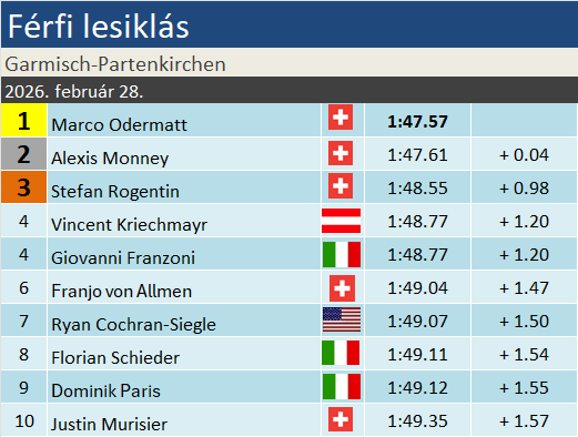 Marco Odermatt szoros csatában, négy századmásodperccel győzte le Alexis Monneyt a Kandahar-Rennenen, s minthogy Franjo von Allmen csupán hatodikként zárt, szinte biztosra vehető az két futammal a vége előtt, hogy újra övé lesz a királyszám kis kristálygömbje. Stefan Rogentin kihasználta az alacsony rajtszám előnyét, így szintén dobogón ünnepelhet. Vincent Kriechmayr bő 2 tizeddel szorult le a dobogóról, Franzoni pedig a korábbi kétszeres világbajnokkal holtversenyben mutatkozott be Garmischban. Az állapotok egyébiránt igazán tavasziasak voltak, a hőmérséklet meghaladta a 10 fokot.