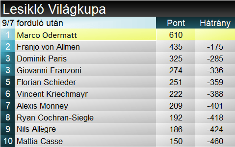 Marco Odermatt 54. alkalommal győzött a Világkupában, amivel beérte a férfi örökranglista harmadik helyén Hermann Maiert. Még egyre van Vreni Schneider svájci csúcsához. Lesiklásban nyolcadik sikerét aratta. A szakági pontversenyben 175 pontos előnyre tett szert Odermatt, vagyis lényegében eldőlt, hogy zsinórban harmadjára szerzi meg a kis kristálygömböt. Alexis Monney hetedik dobogóját szerezte a Világkupában, a másodikat ezen a télen. Stefan Rogentin hét pódiumnál tart, lesiklásban harmadszorra zárt a harmadik helyen.