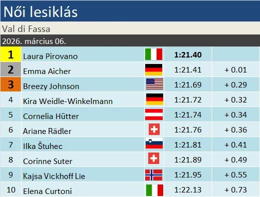Emma Aicher 11. dobogóját ünnepelhette, a 4.-et lesiklásban. Breezy Johnson ma jubilált, 10.-szer végzett VK top10-ben, de az aktuális olimpiai és világbajnok továbbra sem tudott még világkupafutamot nyerni. Hogy a világversenyeken kívül mennyire nem termékeny, mutatja, hogy idén is ez mindössze a második dobogója.