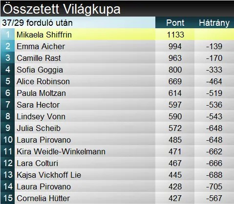 Az összetettben is egyre szűkül az olló, lévén, hogy az olimpia ót arendezett 4 verseny alatt Aicher 310 pontot szerzett. Ezzel a két hete meglévő 449 pontos előnye mindössze 139-re olvadt. Ilyen ütemmel az sem elképzelhetetlen, hogy vasárnap az összetett vezetést is átvegye Shiffrintől, ha továbbra is tartani tudja remek gyorsszámos formáját.