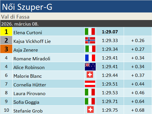 Elena Curtoni a héten töltötte be 35. életévét, s a korábbi kétszeres szakági ezüstérmes egy nem várt győzelemmel ajándékozta meg önmagát. Negyedik alkalommal győzött a Világkupában, másodszor Szuper-G-ben. Több mint 3 évvel ezelőtt, a 2022 decemberi St. Moritz-i lesikláson diadalmaskodott legutóbb. Olasz részről Pirovano és Goggia kétszer, Nicol Delago egyszer nyert idén. (S persze Brignone kétszer az olimpián.) Kajsa Vickhoff Lie 11. dobogóját ünnepelte a mai napon, a hetediket szuperóriásban. A 29 éves Asja Zenere pedig teljesen váratlanul szerezte meg karrierje első VK- dobogóját. Az Európa Kupában szerzett négy győzelmet, közte egy Szuper-G-ben. A Világkupában a Copper Mountain-i óriáson elért 9. helyezés volt eddigi legjobbja.