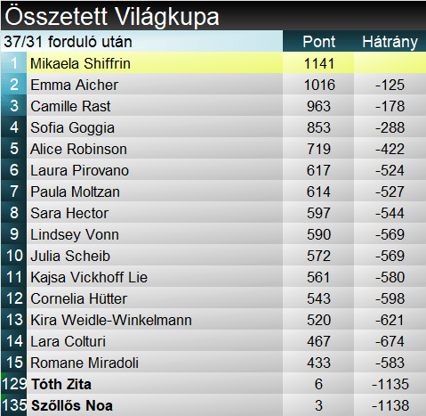 Mikaela Shiffrin (23.) nem kockáztatott eleget, Aicher kiesése nyilván felülírt sok mindent. Az Európa Kupában szakági listavezető Sara Allemand (32-essel a 26.) még csak pár pontra volt képes, Asja Zenere (33-assal a 3.) azonban nagyot robbantott! Óriás-műlesiklói erősségeit maximális kihozta a pálya. A síléceket gyönyörűen engedte futni, és a rázkódásokat egyáltalán nem lehetett érezni mozgásán. Letaszította a dobogóról Robinsonékat, ezzel nagy szolgálatot téve Goggiának. S persze magának is, hiszen így az utolsó pillanatban beverekedte magát a VK-fináléra. Fest pedig pórul járt. Egyébként Lie második helyétől is csak egy század választotta el.
