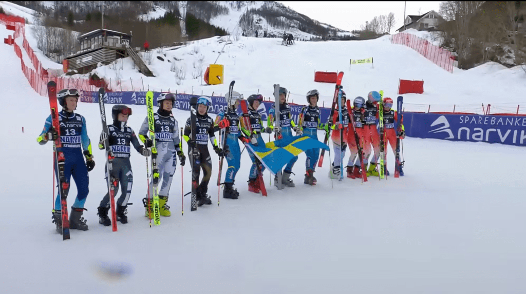 A skandináv nagydöntő kurtafurcsán alakult, hiszen minden egyes futamot csak az egyik résztvevő tudta befejezni. Kezdődött minden Kivela meglepetéspontjával. Nordberg valamivel előrébb volt, amikor 3 kanyarral a vége előtt kicsúszott alóla a külső léce. (Nem sokon múlt a két lány ütközése.) Mindez nem osztott-szorzott, hiszen a finn lány gyönge időt síelt. Pyrro kiesésével pedig azonnal a svédek kerültek hatalmas előnybe, hiszen a finnek messze legjobb embere hibázott. Matematikailag nem volt még kijelenthető, reálisan mégis eldőlt minden az utolsó női párban. Suni pár kapu után hibázott, Landström pedig ütőképes futamot teljesített. Palosäri kiesése pecsételte meg a finn aranyálmokat.