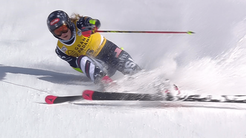 Thea Louise Stjernesund (7.) rendszeresen húzza ki az éles próbababa szerepével járó 1-es rajtszámot. Kulturált menete nélkülözte az érdemi kockázatvállalást, ennek megfelelően a jóval szűkebb rádiusszal kanyarodó Camille Rast (1.) alaposan, csaknem másfél másodperccel elverte a norvégot. Pedig a köztes letörésnél volt egy nem épp optimális, széles kanyarvétele, de ez mit sem érződött ritmikáján. Julia Scheib (2.) fent még korai kanyarokkal némi hátrányra tett szert. Lényegében azt az alig több mint egyetlen tizedet őrizte a végéig. A lankás átkötőn és a második letörésnél nagyon finom lécterhelést alkalmazott. Nem dőlt el még semmi. Az átmenetnél Paula Moltzan (3.) lécei hasonlóan megemelkedtek, mint Rasté. Tisztán síelte meg a felső meredek szakaszt. A középső részben erősen a belső sílécre támaszkodott, de így is tartotta a vonalat. A céllejtő bejáratánál nagyot kellett mentenie, de végül jól korrigált.