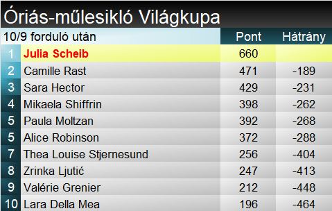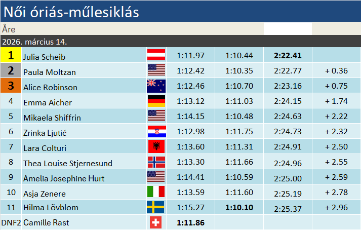 Julia Scheib ötödik győzelmét aratta a Világkupában, úgy összességében, mint ezen a télen. Fantasztikus szezonja van, hiszen további két második hely is gazdagítja statisztikáját. Kétségtelenül megérdemelten emelheti magasba Hafjellben a kristálygömböt. Paula Moltzan tízedik alkalommal állt fel a Világkupa-dobogóra. Csak óriásban negyedszerre zárt TOP3-ban. Az első győzelmére tovább kell várnia. Alice Robinson 24 pódiumnál tart, ebből hetet ezen a télen jegyez.