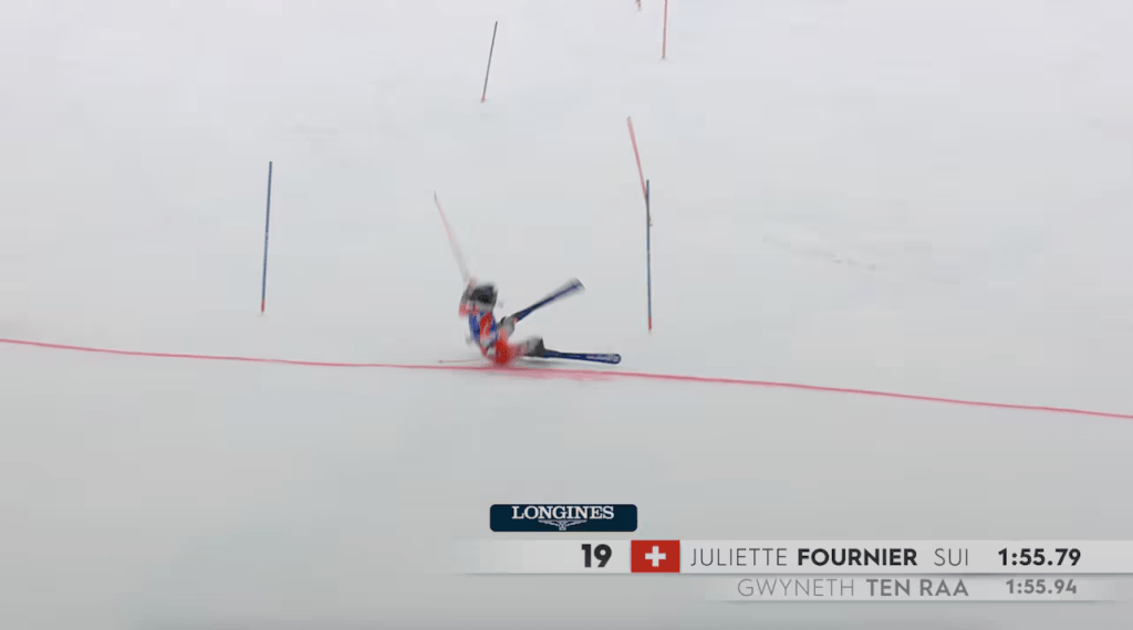 A Benelux-állam reprezentánsa már jó darabig trónolt a vezető helyen. Eközben kiesett többek közt Zaytseva és Myking. Fournier (4.) nagyot küzdött az elemekkel, de minden necces helyzetet megúszott. A meredeksízése különösen ritmusosnak volt mondható. Emlékezetes módon vette át a vezetést a svájci: miközben a célvonal előtt a megszokottak szerint előrevágta felső testét, lécei összeértek, így célba érése eséssel valósult meg. Kucera (10.) lendülete és energiája látványosan elfogyott az aljára, Butler (16.) pedig indiszponált felső kanyarjain vesztett sokat. Kanto (3.) egy kiérdemelt sikítással zárta menetét. A meredekre, meg a hóviszonyokra is nagyon ráérzett a finn lány, a ritmikába pedig nagyritkán került homokszem. Élre állt, de a dobogó nem volt benne a pakliban per pillanat. Bieler az igazán meredeket levezető vertikális kombinációnál hibázott, az őt követő Ertl (12.) nagyobb gondok nélkül, visszafogott tempóban érte el a célvonalat.
