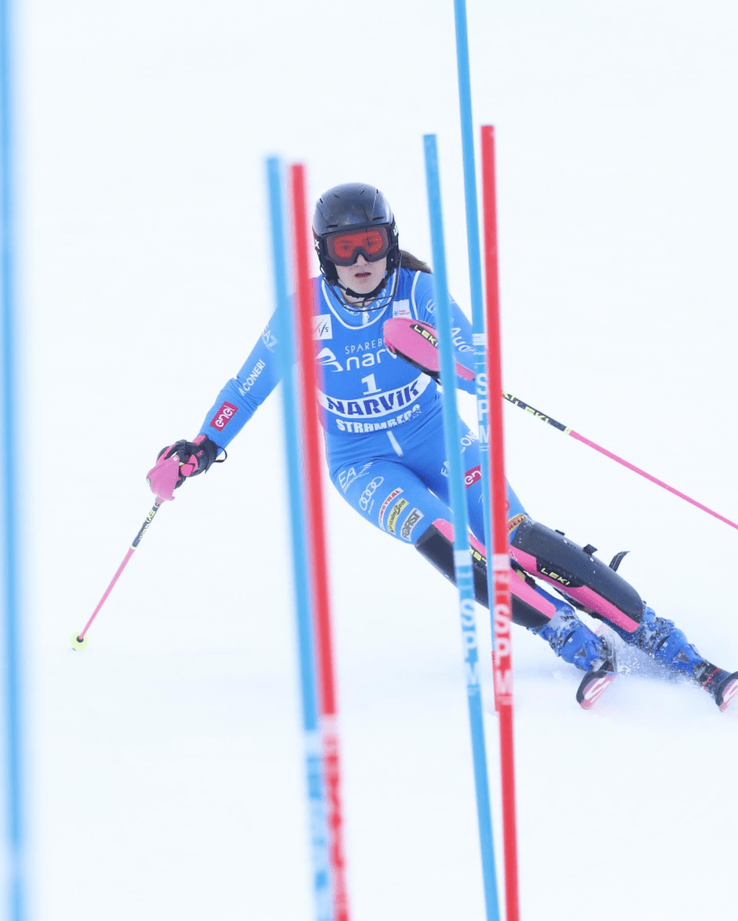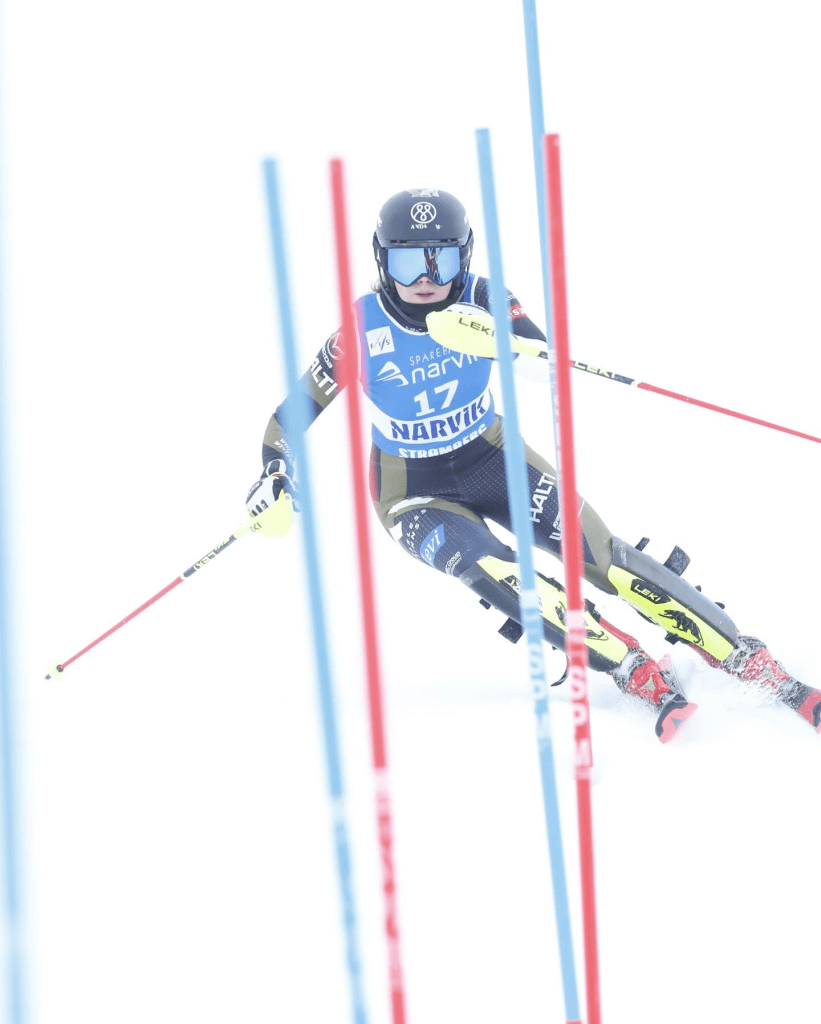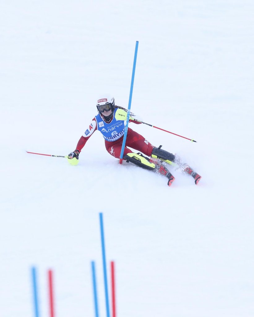 Délutánra megélénkült a szél, csak hogy még „jobb” legyen a lányok dolga. A cseh edző felső szakasza nem volt olyan nehéz, a meredeken viszont ugyanúgy széles irányváltásokra kellett készülnie a mezőnynek. Katarina Šrobová (18.) bő 6 másodperces hátránnyal került be a TOP30-ba, ehhez képest megsíelte a második legjobb délutáni futamidőt. A pálya romlása előidézte azt a faramuci helyzetet, hogy az eredendően lesiklóként számon tartott Eva Unhjem Johansen (15.) neve mellé került a legjobb időeredmény. Nem egy Cuche-kaliberű szlalomosról beszélünk, de azért ilyet se láttunk még világversenyen. A korai indulás egyértelműen előny volt, de persze élni is kellett az eséllyel. A norvég után hárommal Elena Riederer (14.) például szűken átvette a vezetést, ugyanakkor a meredeken igencsak darabossá vált mozgása, így Shaienne Zehnder (9.) ott alaposan elverte az osztrákot. Még bátrabban mozgott a nyújtott kanyarokban a luxemburgi Gwyneth Ten Raa (7.), kezdeti hátrányát ott fordította a maga javára.