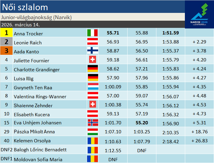 Anna Trocker döbbenetes fölénnyel nyerte meg a junior-világbajnokság szlalomversenyét, amelyen Pászka Mikolt Anna a legjobb 30 között zárt! A két napja óriás-műlesiklásban is magabiztosan győzedelmeskedő olasz lány ma sem hagyott kétséget afelől, ki a mezőny legjobbja. Az első futamot követő előnyét megduplázva 2.29-cel utasította maga mögé Leonie Raichot. A nagyon-nagyon nehéz körülmények közt megrendezett verseny valóságos roncsderbit hozott, a 100 indulóból 62 jutott a délutáni futamba, s mindösszesen 50-en teljesítették mindkét menetet. A különbségek hatalmasok lettek, a dobogóra felállt finn Aada Kanto 3.78-as elmaradást szedett össze, a többiek mind 4 másodpercen túl végeztek. Mikolt pedig élt az eséllyel, a 40. helyről fordulva a 29. helyet szerezte meg élete első junior-vb-jén, elsőéves FIS- versenyzőként. Kelemen Orsolya a 40. helyen végzett.