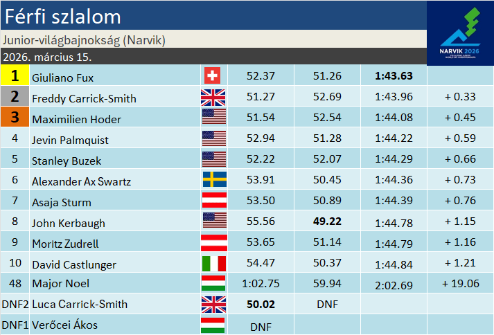 A 45. Alpesi Sí Junior-világbajnokság zárónapján a megszokottak szerint a fiúk szlalomversenyét rendezték. Színvonalas küzdelemre volt kilátás, hiszen hat TOP100-as és tucatnyi TOP150-es (azaz VK- érett) síző alkotta a mezőnyt. Nem beszélve azokról, akik a ranglistás pontok kiosztásakor nem voltak szerencsések, és nem valós képességeiknek megfelelő FIS- pontszámmal rendelkeznek. A tegnapi női verseny után pedig nem kellett elvetni a komoly meglepetést sem. A rajtlistán szerepelt mindhárom Carrick-Smith- fivér, s persze a magyarok (Major Noel és Verőcei Ákos) is igyekezték kihozni a maximumot.