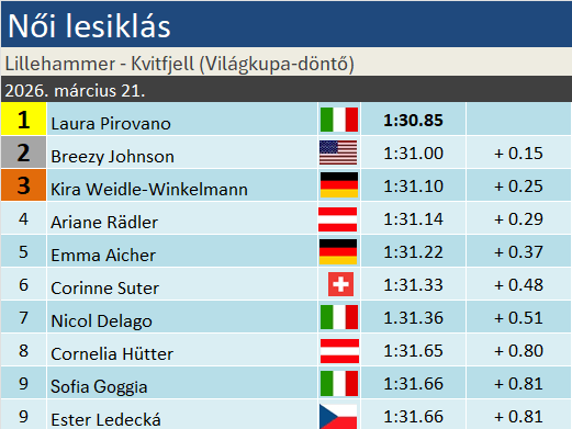 Rávilágított a nap Laura Pirovanóra a szezon hajrájában: két, Val di Fassán aratott egyszázados győzelme után az élről várhatta a Világkupa-döntőt, és ma lábai nem remegtek meg, így győzelemmel hódította el meglepetésszagú, de maximálisan megérdemelt szakági elsőségét. A világ- és olimpiai bajnok Breezy Johnson részéről továbbra is várat magára az első Világkupa-siker; ma másfél tizeddel szorult a második helyre. Kira Weidle-Winkelmann állt még fel a napi dobogóra, a szezon szempontjából azonban ez nem valósult meg: Johnson két pontocskával előzte meg őt. Ariane Rädler négyszázaddal szorult le a napi TOP3-ról, de Emma Aichert így is megelőzte. Így tervei nem valósultak meg, és összetettben csak 95 pontra csökkentette hátrányát Shiffrinhez képest.