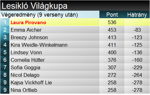 Laura Pirovano (1.) részéről egy kilencedik hely is elegendő volt, amennyiben Aichert nem taszítják le a dobogóról. Egyáltalán nem taktikázott az olasz, ellenben minden egyes kanyart a határon teljesített. Már alaptempóban sem maradt el az amerikaitól, a hullámokon szépen lovagolt, ugratói szépen össze lettek rakva. Az egyik jobbosnál kicsit mélyre került (botja beakadt egy pillanatra a kapuba), de ez nem rendítette meg, a kulcskanyarokat remekül oldotta meg. Másfél tizeddel előzte Johnsont, s ami még lényegesebb, Aichert arrébb lökte – ezzel megnyerte a VK-t! Kajsa Vickhoff Lie (15.) nem tudta megismételni az erős edzéseken nyújtott teljesítményét. Több kisebb kicsúszással elkerülte ma az élmezőnyt.