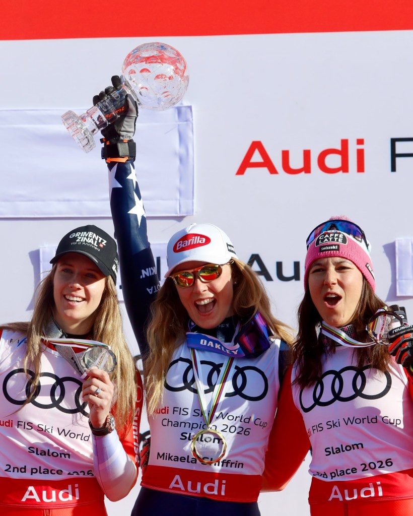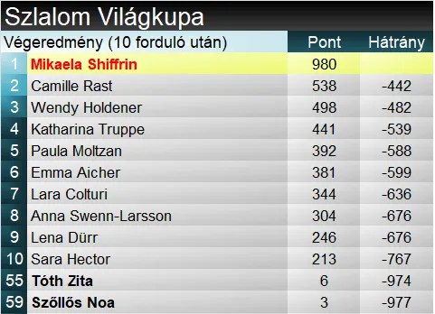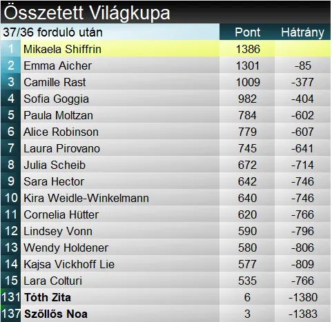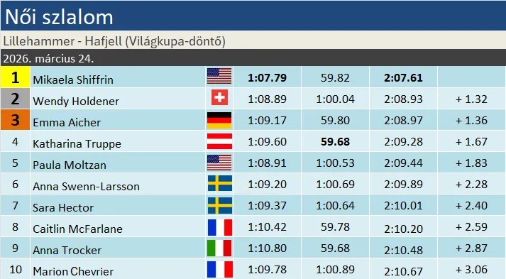 Mikeala Shiffrin már januárban bebiztosította karrierje 9. szakági elsőségét szlalomban, de innen sem hagyott alább. Az olimpiával együtt 11 versenyt rendeztek idén, amiből tízet megnyert, és csak Kranjska Gorán kellett beérnie a második hellyel. 110. VK-sikerét aratta, ami pedig fontosabb, összetettben előnye 85 pontra nőtt Emma Aicherrel szemben. Ezzel a német győzelmi kényszerben lesz az óriásban, ha meg akarja nyerni az összetettet. Ez utóbbi viszont nem tűnik egyszerűnek, Aicher legjobbja óriásban egy 4. hely a múlt hétről. A német egyébként 12. alkalommal végzett idén dobogón, szlalomban negyedszer. Wendy Holdener 55 dobogós helye a negyvenegyediket szerezte ma szlalomban, idén egyszer sem végzett eddig ennyire előkelő helyen.