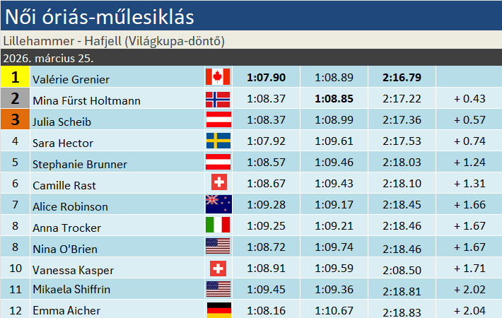 Mina Fürst Holtmann (2.) azonban nem rettent meg. Rendkívül sokat kockáztatott, szinte a kapuk tövében síelt végig, de hiba nélkül végig tudta vinni a futamát, tovább növelve még hozott előnyét is! Emma Aicher (12.) már tudta, a nagy kristálygömbért már nem, első óriásban megszerzett dobogójáért viszont még síelhet. A fenti átmenetben azonban hatalmasat hibázott, legalább egy másodpercet dobott el. Szinte már költi, hogy épp Shiffrin mögött két századdal zárta a versenyt.