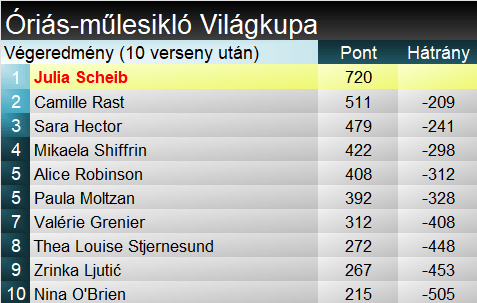 Julia Scheib 9 dobogós helyezéséből nyolcat szerzett az idei szezonban, ebből ötször legyőzőre sem talált. A szakági világkupát jelentős, több mint 200 pontos előnnyel nyerte meg. Legutóbb épp 10 éve nyerte szintén osztrák a szakági világkupát, akkor Eva-Maria Brem síelt hasonlóan ihletett szezont.