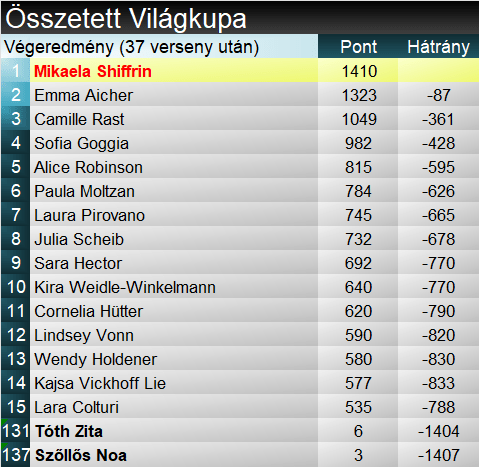 Az összetettben végül nem történt meg a meglepetésszámba illő fordulat, két szezon szünet után ismét Mikaela Shiffrin nyerte az összetett világkupát. Győzelme elsősorban a szlalomban mutatott dominanciájának volt köszönhető, óriásban ugyanis közel sem volt annyira veszélyes az élmezőnyre. Igaz, a folyamatosan stabil, erős pontszerzései nélkül nem lett volna meg az első hely. Hatodik összetett sikerével utolérte az e tekintetben legsikeresebb női sízőt, Annamarie Moser-Pröllt, aki a hetvenes években 9 év leforgása alatt szintén hatszor nyerte meg az összetettet. Az osztrák 1980-ban, hatodik sikere után vonult vissza – nem titok, az utóbbi napokban rebesgették, hogy Shiffrin és Kilde együtt jelenthetik be visszavonulásukat.